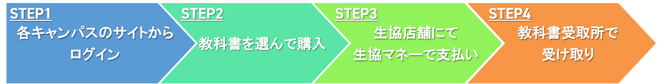 教科書受取所で受け取り 下記を持って生協の教科書受取所へ行き、教科書を受取ります。