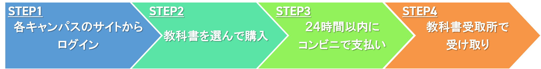コンビニ支払後、必ず印刷した申込書とコンビニ支払いのレシート(生協マネーの場合は生協マネーで支払った際のレシート)を教科書受取所にご持参ください。